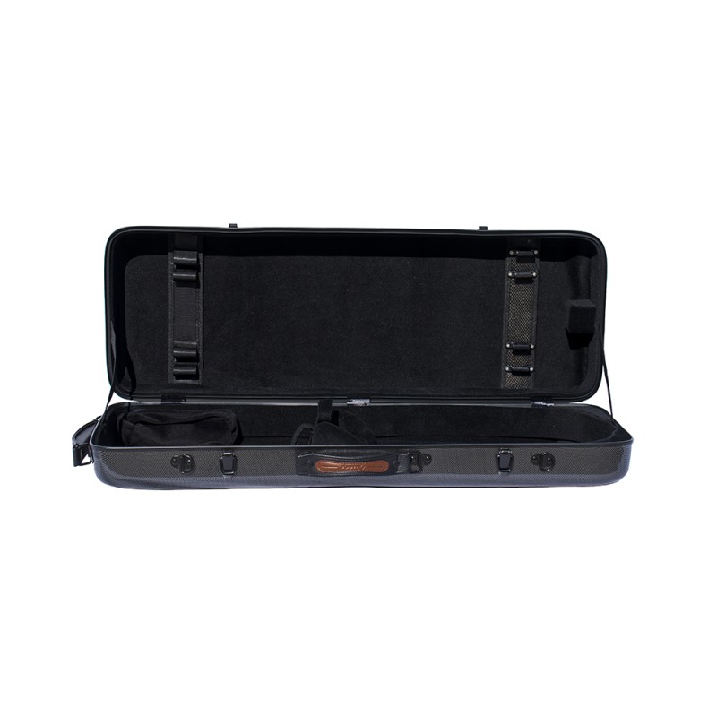 Estojo para violino 4/4. Estojo em compósito. Exterior em policarbonato. Interior em veludo. Asa lateral e mochilas. Espaço para 4 arcos. Compartimento para acessórios. Peso: 1,9kg.