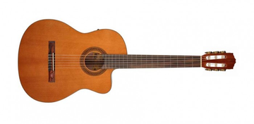 Guitarra clássica espanhola electrificada, tampo em cedro, laterais e fundo em Sappelie, cutaway e pickup Fishman Isys T com afinador.