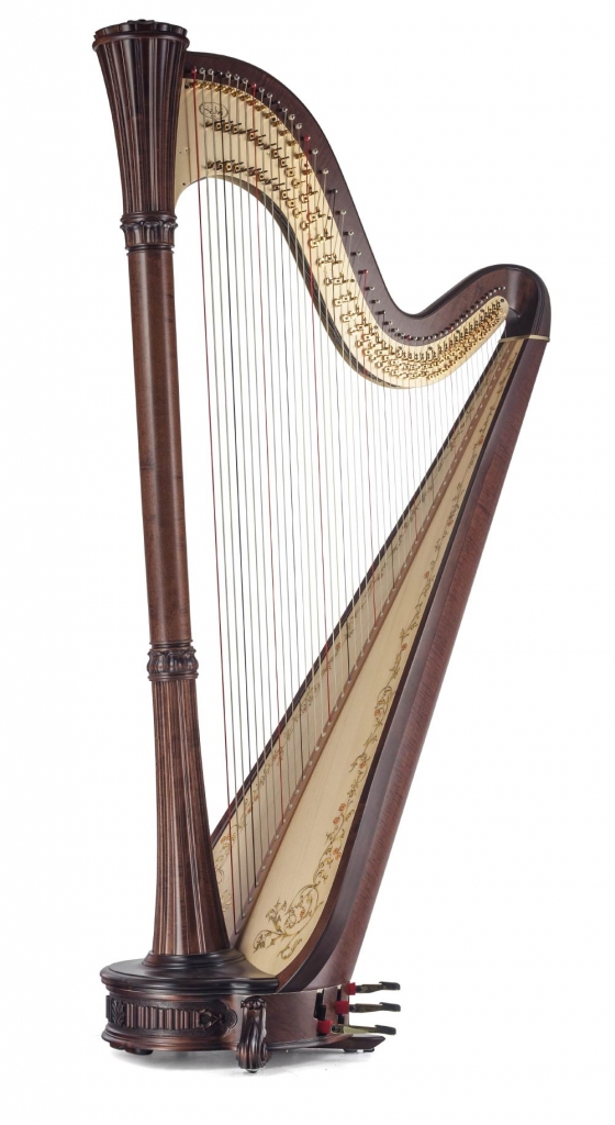 Harpa de pedal de 47 cordas, da série Concert Grand. SOL 0 oitava a DO 7ª oitava. Altura 188 cm. Largura 100 cm. Caixa harmónica 55 cm. Peso 40 Kg.