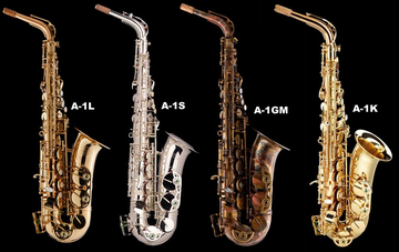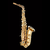 Saxofone Alto dourado, chave F# agudo, suporte duplo nas chaves mais graves, gravado, lacado.