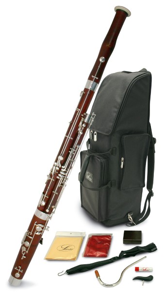 Fagote de estudo, 22 chaves, corpo em maple alpino, chave de ré agudo, 1 tudel, chaves prateados, estojo.