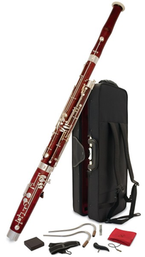 Fagote de conservatorio, 22 chaves, corpo em maple alpino, sistema de chaves para mãos pequenas, chave de ré agudo, 2 tudeis, chaves prateados, estojo.