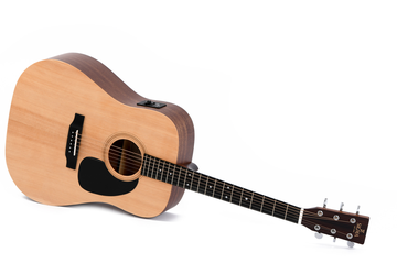 Guitarra acústica electrificada formato Dreadnought, tampo maciço em Abeto Sitka, lateral e fundo em Mogno, braço em Mogno Low Profile, pestana e pente em osso, escala em Micarta, escala 645mm, pestana com 42,9mm, acabamento mate ultra-fino UV, cordas Addario EXP16, pickup Sigma com afinador.