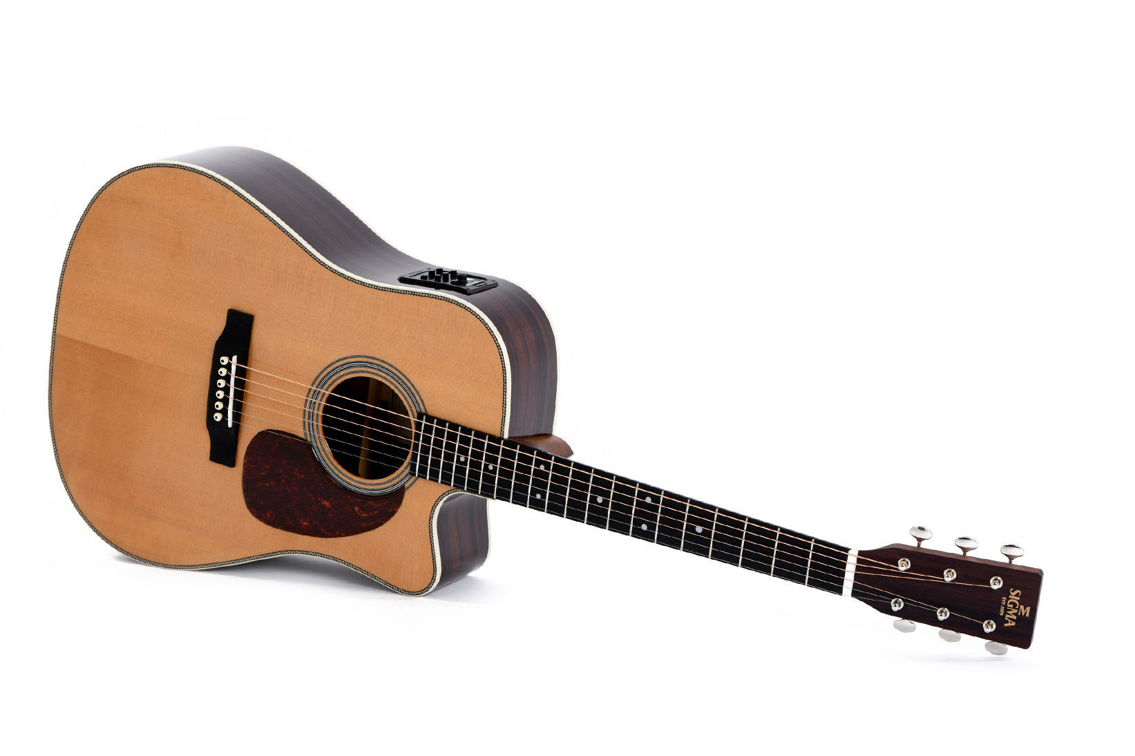 Guitarra acústica electrificada formato Dreadnought, tampo maciço em Abeto Sitka, lateral e fundo em Tília, braço em Mogno Low Profile, pestana e pente em osso, escala em Micarta, escala 645mm, pestana com 42,9mm, acabamento mate ultra-fino UV, cordas Addario EXP16, carrilhões Grover, pickup Fishman Presys+ com afinador.