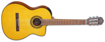 Guitarra Clássica Electrificada, tampo em Abeto, aros e fundo em Mogno, braço em Mogno, escala em Laurel, ferragens cromadas, pickup Takamine TP-E com afinador, acabamento brilhante.
