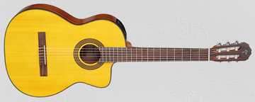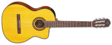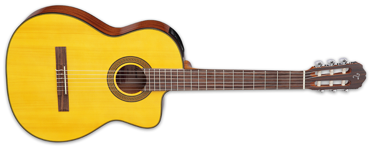Guitarra Clássica Electrificada, tampo em Abeto maciço, aros e fundo em Mogno, braço em Mogno, escala em Pau Rosa, ferragens douradas, pickup Takamine TP-4TD com afinador, acabamento brilhante.