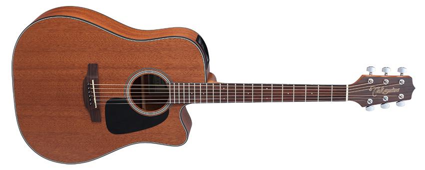 Guitarra Acústica Electrificada com formato Dreadnought, corpo em Mogno, braço em Mogno, escala em Ovangkol, ferragens cromadas, pickup Takamine TP4T com afinador, acabamento natural satinado.