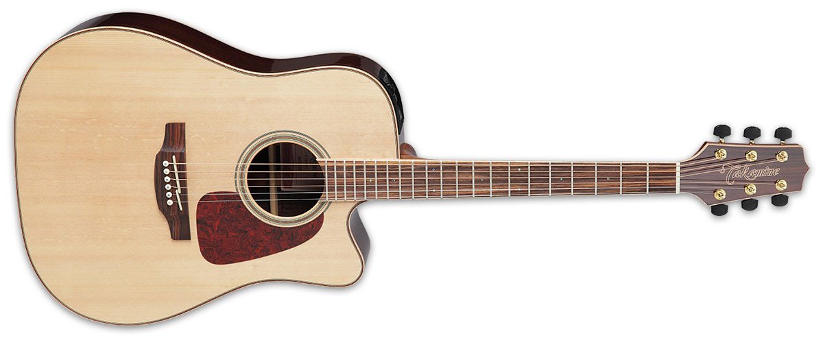 Guitarra Acústica Electrificada com formato Dreadnought, tampo em Abeto maciço, aros e fundo em Pau Rosa, braço em Mogno das Honduras, escala em Pau Rosa, ferragens douradas, pickup Takamine TK-4TD com afinador, acabamento brilhante.