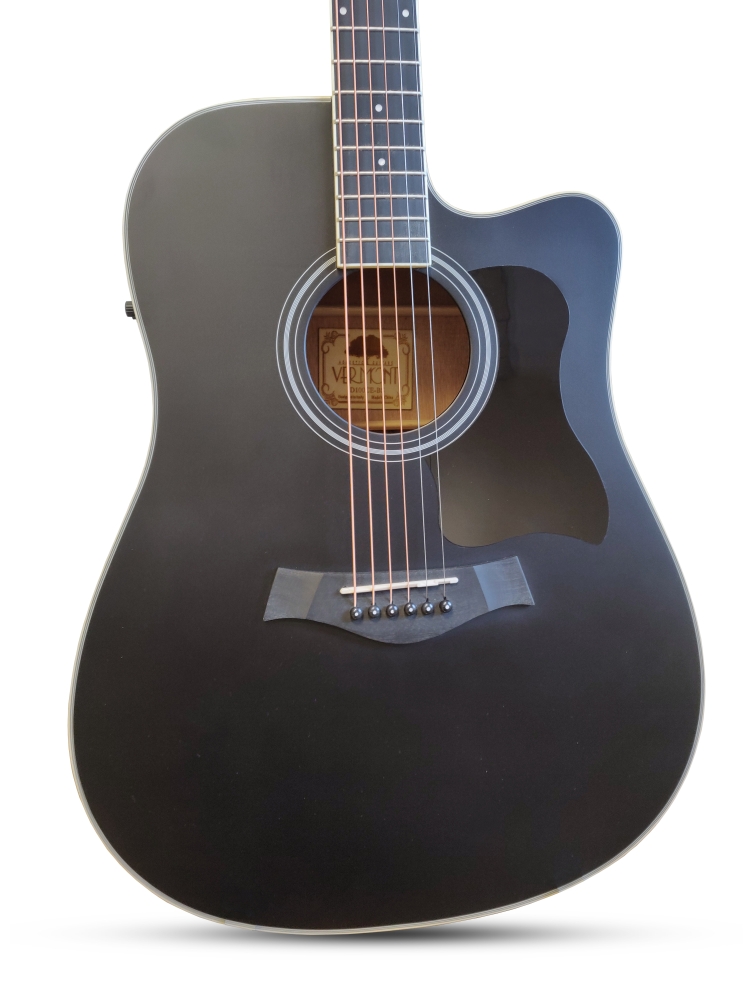 Guitarra electroacústica, tipo Dreadnought com cutaway, tampo em Abeto, fundo e laterais em Sapele, escala e ponte em Richlite. Acabamento preto open pore.