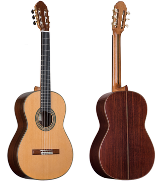 Guitarra clássica espanhola de Luthier, gama profissional, fabricada artesanalmente por Victor Lozano, tampo maciço ou duplo tampo de Pinho Abeto Alemão, aros e fundo em Pau Santo da India, (duplo aro opcional), braço em Cedro, escala em Ébano, verniz Goma Laca, escala 650mm.