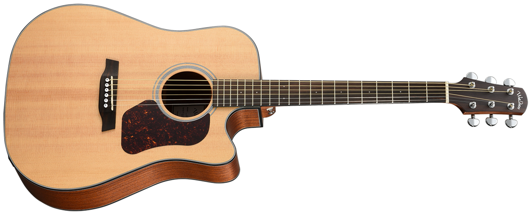 Guitarra electroacústica com tampo Sitka Spruce sólido, fundo e ilhargas Mahogany laminado, braço Mahogany reforçado c/ fibra de vidro, escala e cavalete Rosewood, pestana GRAPH TECH NuBone, roseta/ binding em decal/Plástico ABS Preto, truss rod Two-Way, carrilhões Die-Cast cromados, pickguard Faux-tortoise shell, pickup 'WALDEN Active' EQ & tuner, acabamento UV cured PE - Open Pore Satin Finish, cordas D'ADDARIO EXP11.